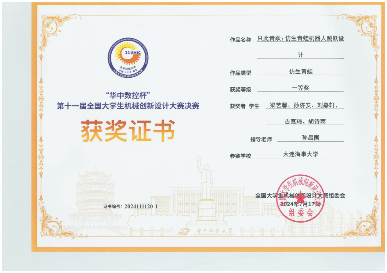 我校国际联合学院(休斯顿国际学院)机械制造及其自动化专业2022级学生梁艺馨、孙济安两名同学,凭借作品“只此青跃:仿生青蛙机器人跳跃设计”喜获全国一等奖。该作品由船舶与海洋工程学院孙昌国老师指导,本次获奖是我校自2014年后再次在该比赛中获得全国一等奖,时隔十年再次登顶。